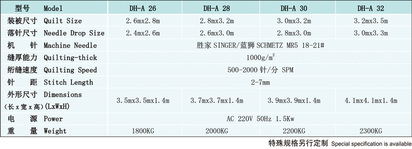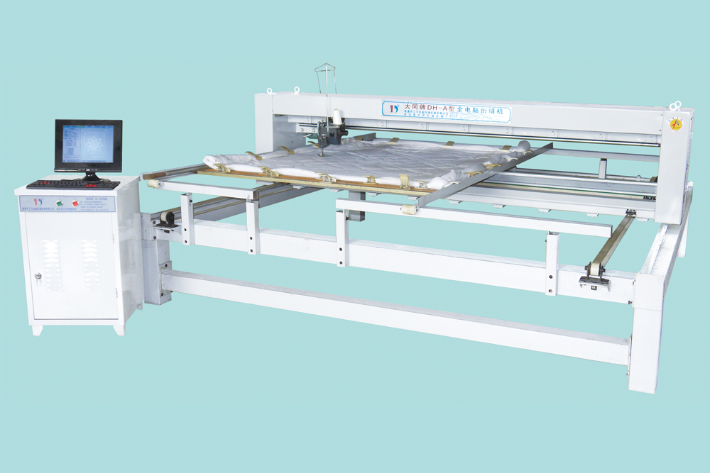 DH-A系列電腦高速絎縫機是制作各種床被、墊罩的縫制設備,縫制效率快、花樣美觀(guān)、圖形精細。該產(chǎn)品結構采用橫梁運動(dòng)方式,縫制時(shí)被巷物不運動(dòng),具有較小的占地面積,可節省40%的使用空間。